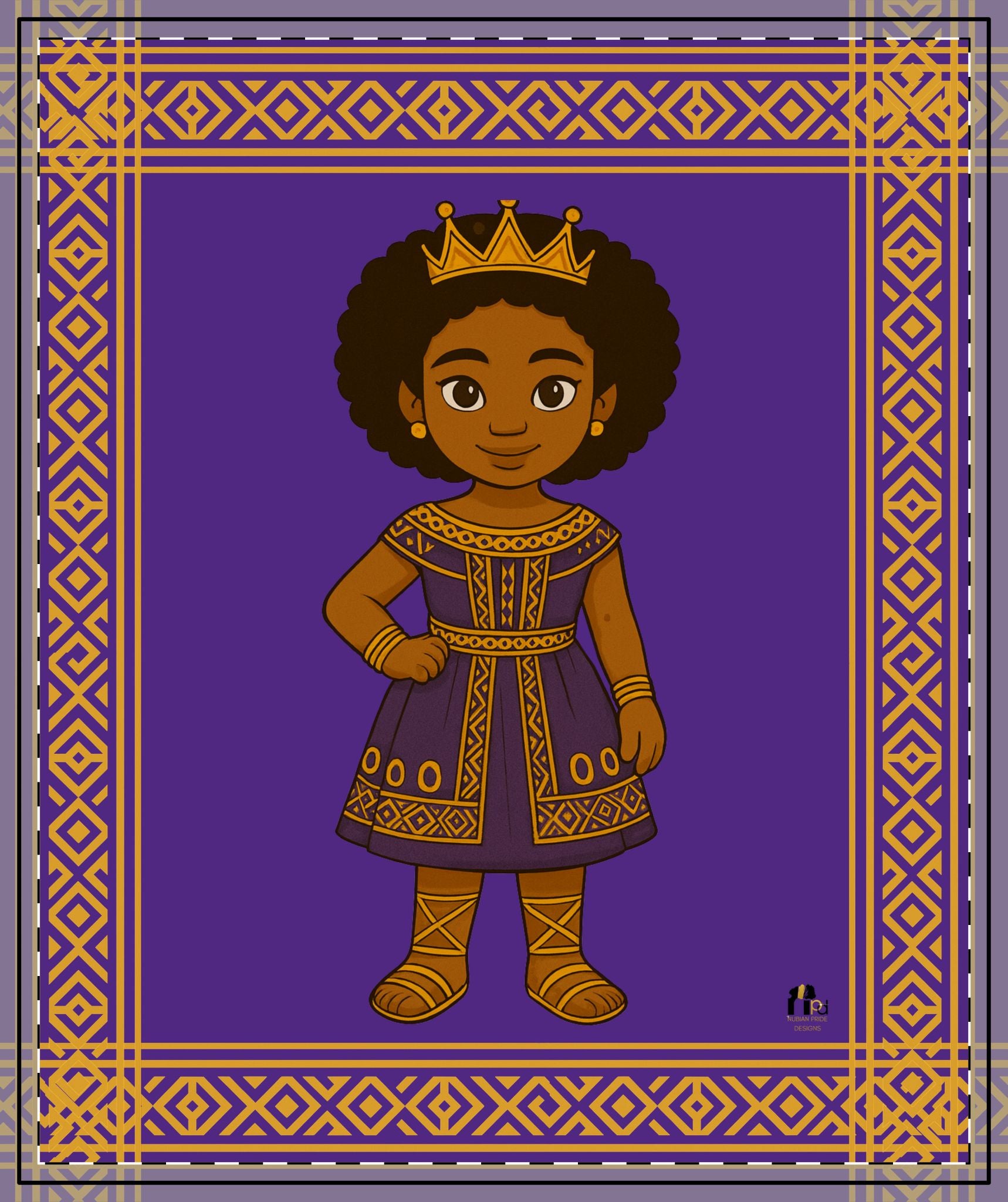 - Bold purple and gold framed design with crowned child illustration